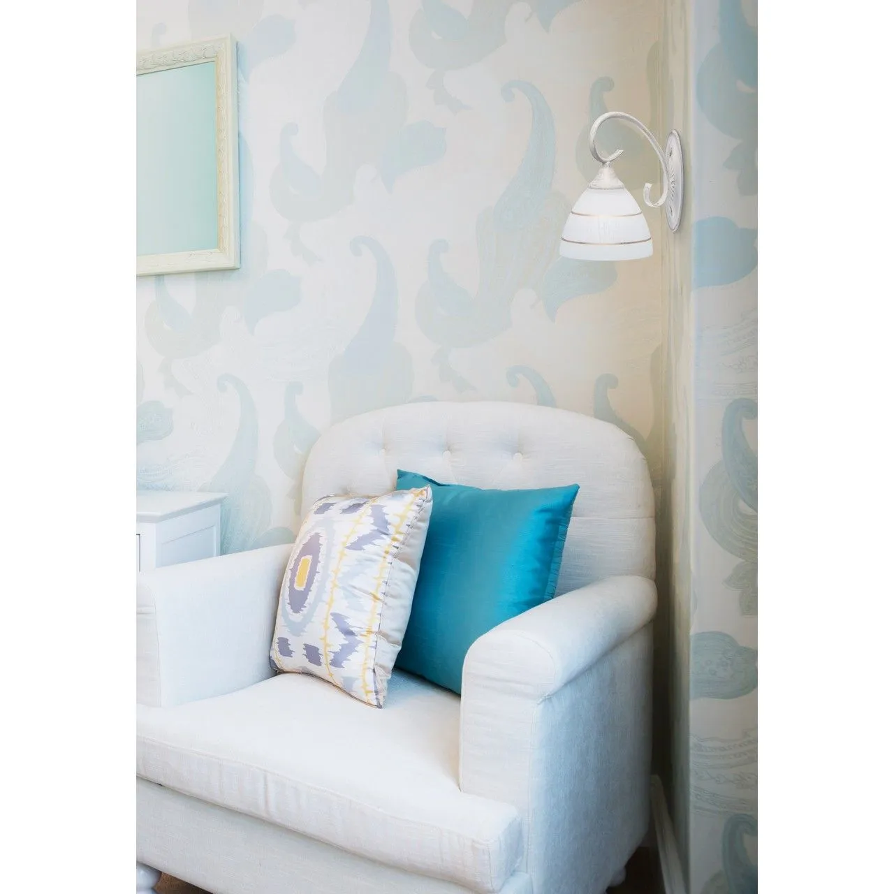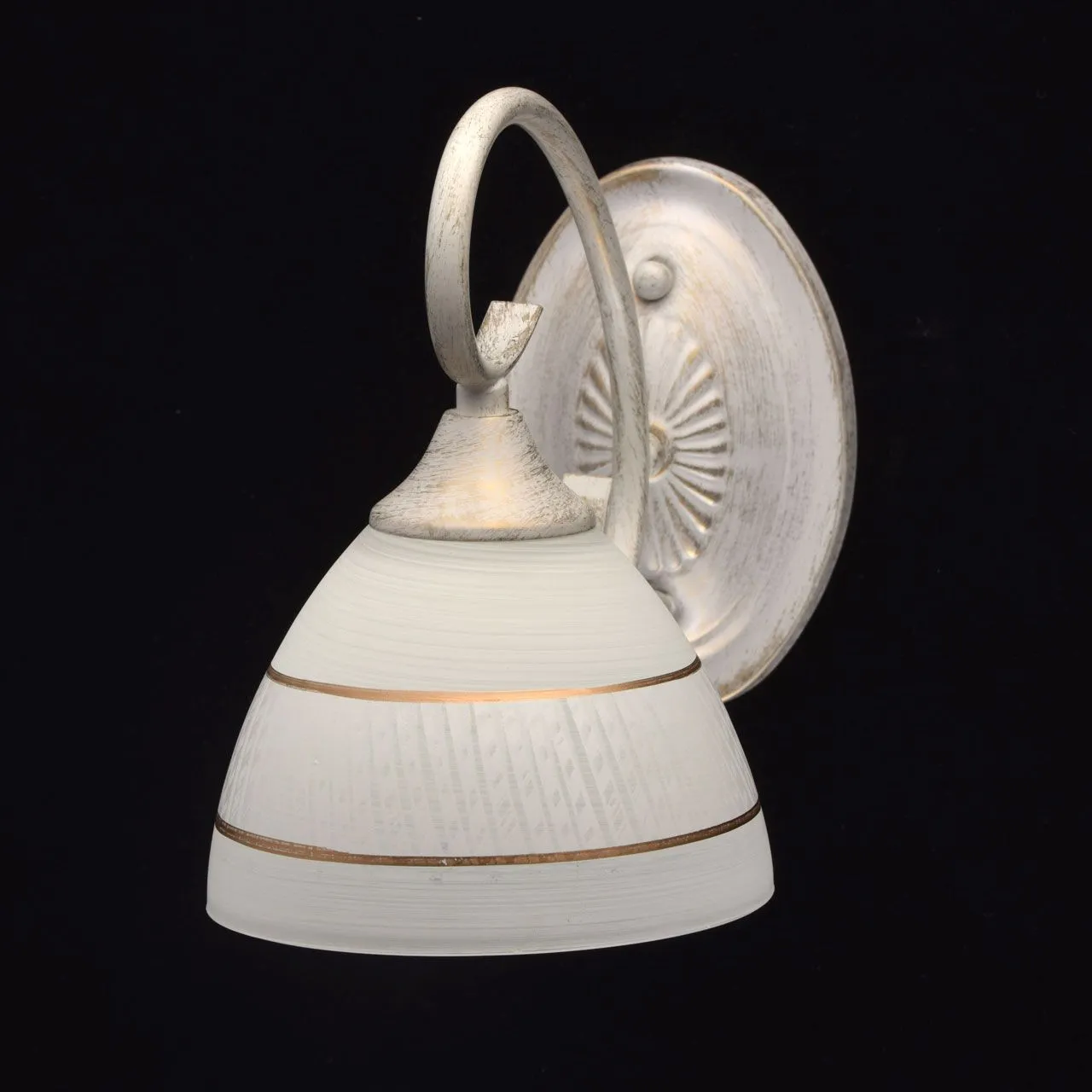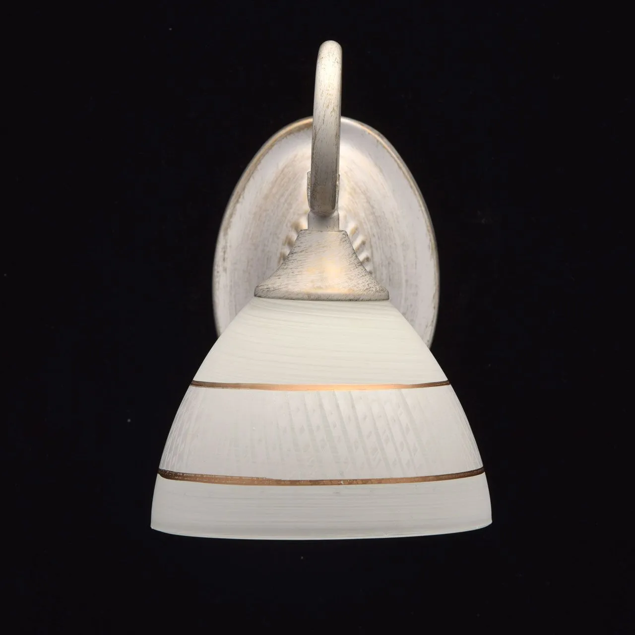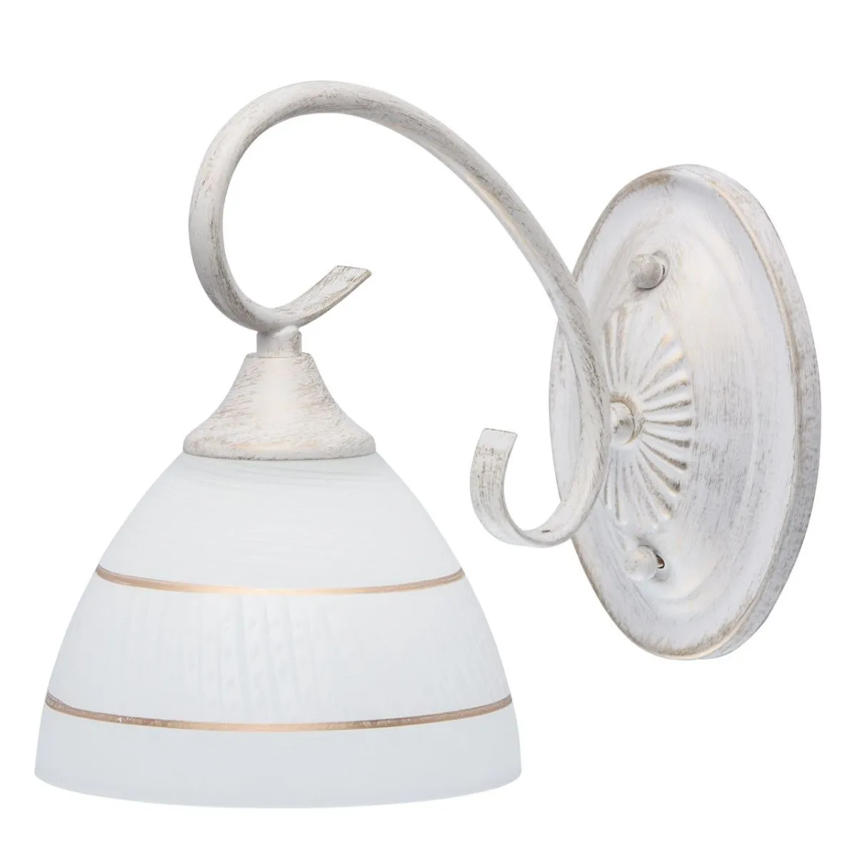 Металлическое основание окрашено в белый цвет с золотой патиной. Плафон: белый стеклянный плафон с